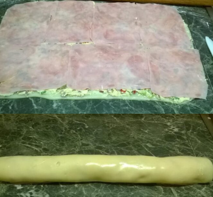 Na vychladený syr natrite pripravenú plnku a potom rovnomerne poukladajte plátky šunky. Celý plát opatrne zrolujte ako závin. Syrovú roládu nechajte v chladničke aspoň 24 hodín – vďaka tomu sa chute krásne prepoja a výsledok bude oveľa lepší.