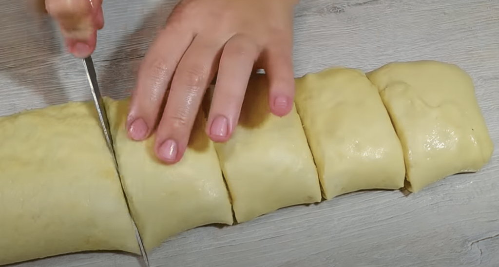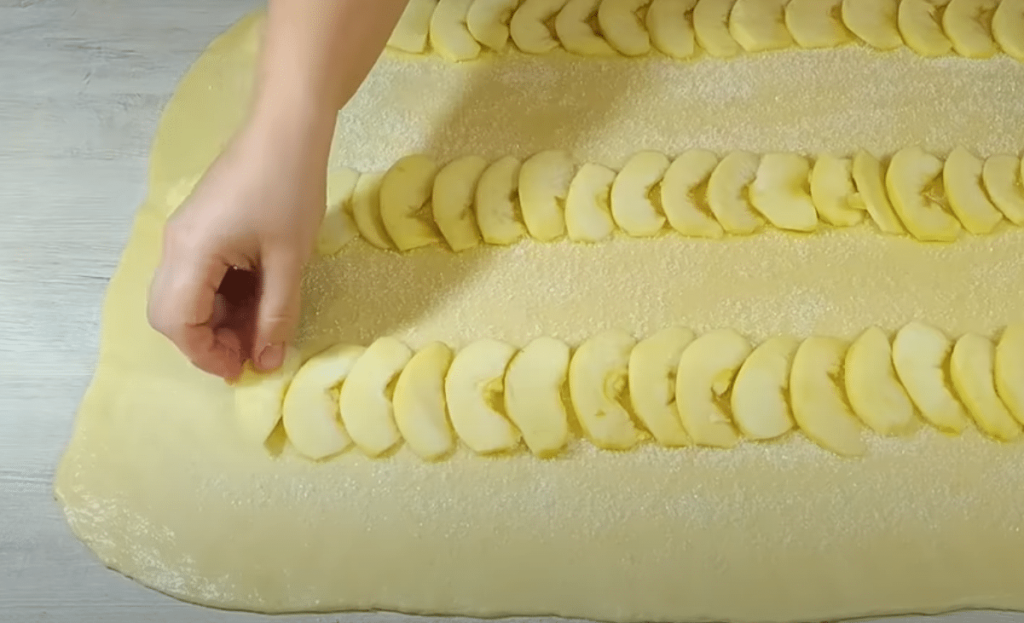 Vykysnuté cesto rozvaľkáme, potrieme jablkovou náplňou a opatrne zrolujeme do rolády. Roládu nakrájame na 10 podobne veľkých kúskov. - Ukladanie do formy: