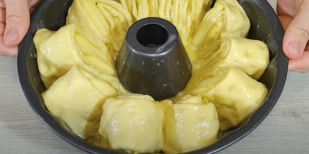 Bábovkovú formu vymažeme olejom. Kúsky cesta ukladáme vedľa seba rezanou stranou nahor. Potrieme rozšľahaným vajíčkom. - Pečenie: