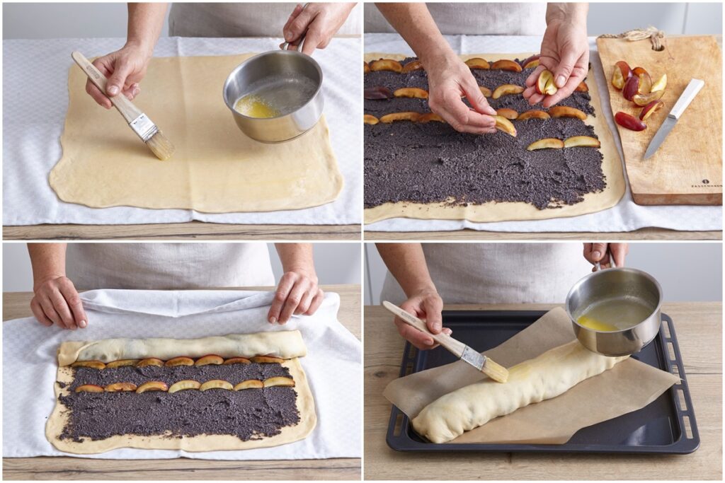 - Príprava závinu: Slivky nakrájame na štvrťky. Lístkové cesto rozvaľkáme, potrieme roztopeným maslom a rozotrieme makový krém. Posypeme kúskami sliviek.