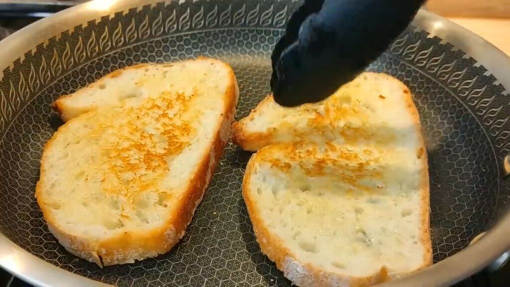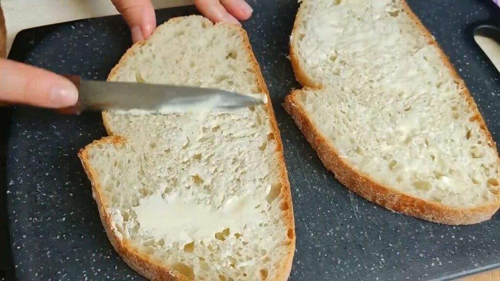 - Plátky chleba z oboch strán potrieme maslom a opečieme na panvici dozlatista.
