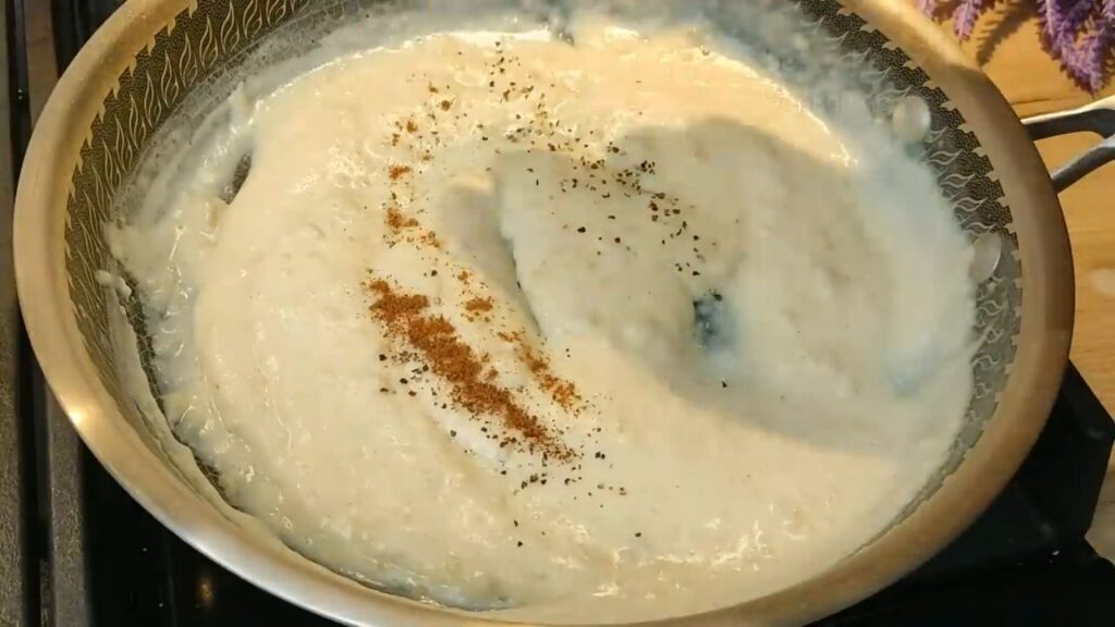- Postupne prilievame mlieko a miešame, kým omáčka nezhustne. Dochutíme soľou, korením a muškátovým orieškom.