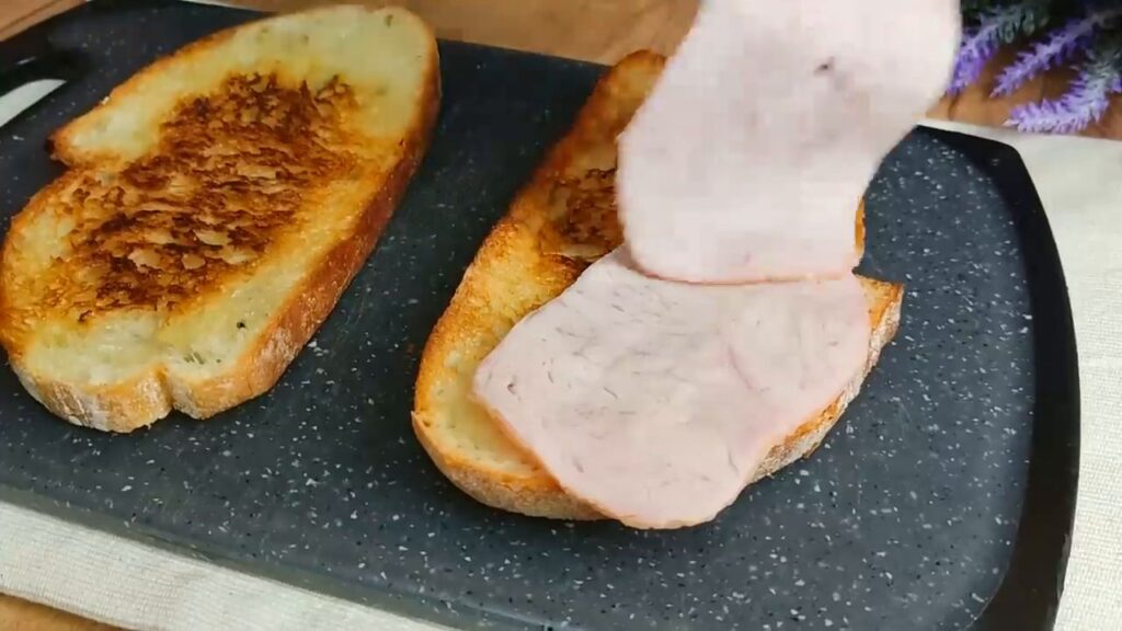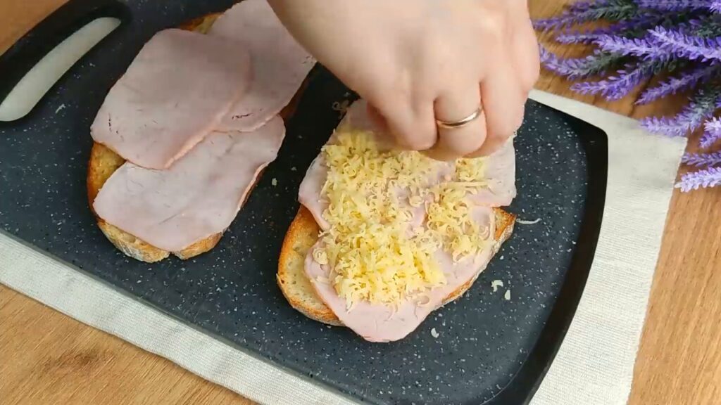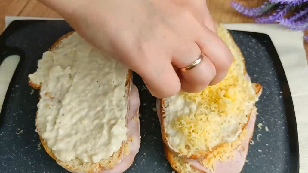 - Na opečený chlieb položíme plátky šunky, posypeme strúhaným syrom, prikryjeme ďalším chlebom, potrieme bešamelovou omáčkou a opäť posypeme syrom.