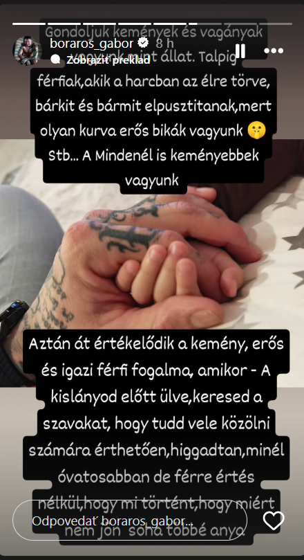 V emotívnom Instastory Boráros opísal celú situáciu zo svojho pohľadu. „Myslíme si o sebe, že sme tvrdí ako zvieratá… Ale pojem silného chlapa sa úplne zmení, keď sedíš pred svojím dieťaťom a snažíš sa nájsť tie správne slová,“ napísal MMA zápasník, pričom zverejnil aj fotku rúk – jeho a dcérky Zory.
